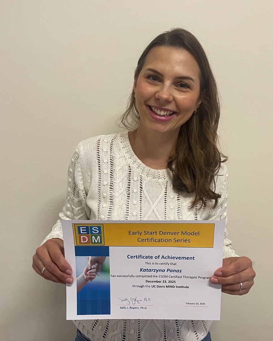Z radością informuję o zakończeniu procesu certyfikacyjnego metody ESDM i uzyskaniu międzynarodowego certyfikatu terapeuty ESDM przez kolejną specjalistkę, Panią mgr Katarzynę Panas – pedagożkę specjalną, specjalistkę PSONI Koło w Skarszewach.